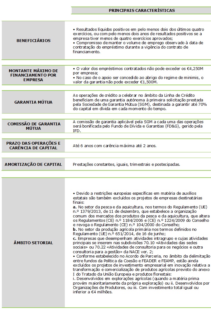 Esta nova Linha de Crédito visa também assegurar a continuidade e reforço das linhas de crédito já existentes, permitindo melhores condições de financiamento disponível às PME, nomeadamente através da redução do custo associado e do aumento dos limites máximos de financiamento por operação.