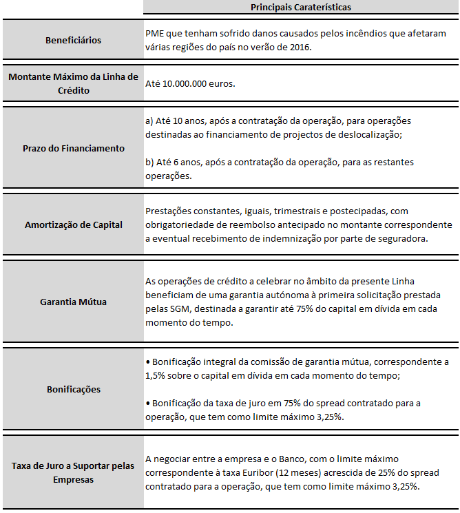 2016-10-01A Linha de Crédito para Apoio ao Setor Empresarial e à Recuperação de Empresas afetadas por Incêndios, disponível a partir de 24 de outubro de 2016, tem uma dotação global de 10 milhões de euros e surge com a finalidade de apoiar as empresas que tenham sofrido danos causados pelos incêndios que afetaram várias regiões do país no verão de 2016, nomeadamente a Região Autónoma da Madeira.