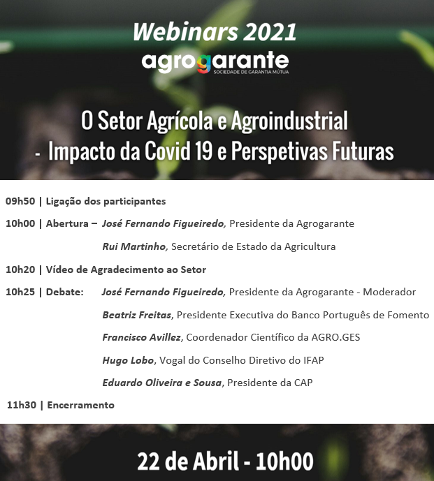 2021-04-24No dia 22 de abril de 2021 a Agrogarante realizou o Webinar "O Setor Agrícola e Agroindustrial - Impacto da Covid 19 e Perspetivas Futuras". José Fernando Figueiredo, Presidente da Agrogarante iniciou a Sessão na qual marcaram presença Rui Martinho, Secretário de Estado de Agricultura e Beatriz Freitas, Presidente Executiva do Banco Português de Fomento.